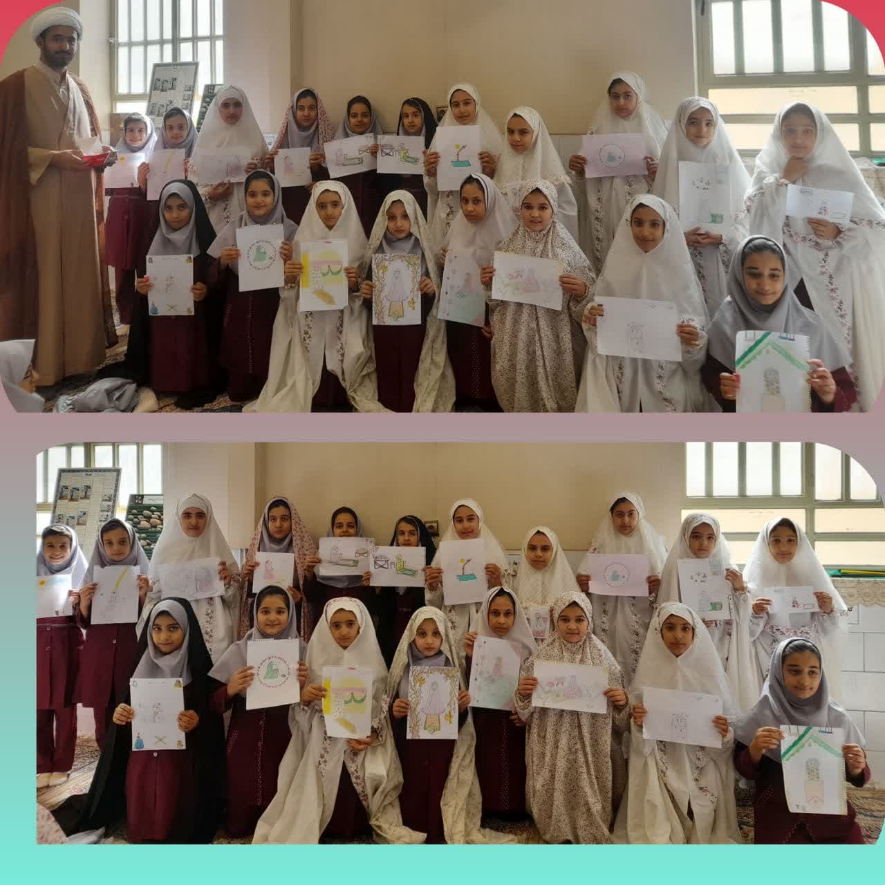 🌷🌷🌷اهداجوایز به دانش آموزان پنجم وششم شرکت کننده ی مسابقه ی نقاشی با موضوع دخترنمازخوان درمراسم نمازجماعت .🌷🌷🌷
